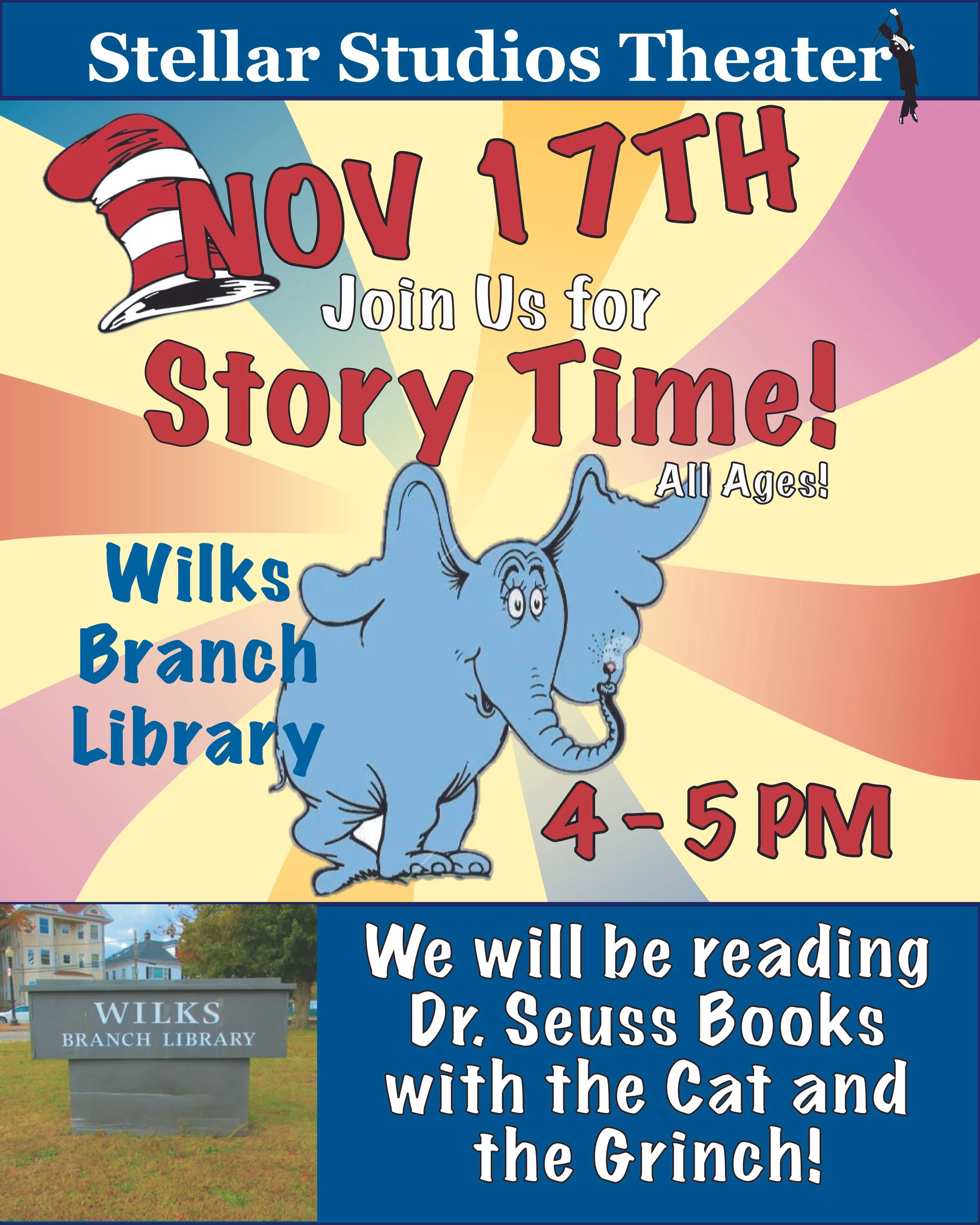 The cast of Seussical will be reading Dr. Seuss books for the Wilks Branch Library Story Time on 11/17 from 4 - 5 PM