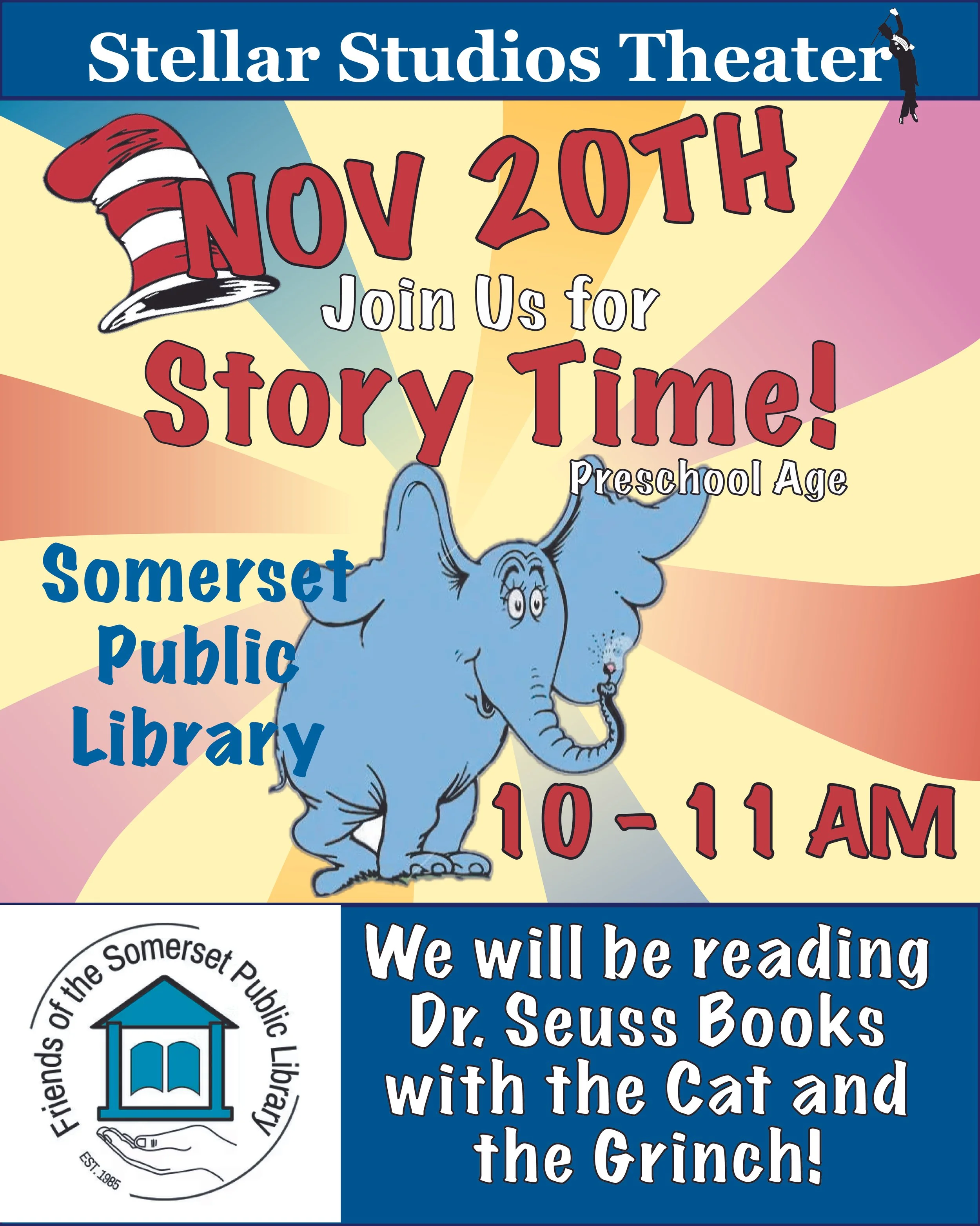 The cast of Seussical will be reading Dr. Seuss books for the Somerset Public Library on 11/20 from 10 - 11 AM